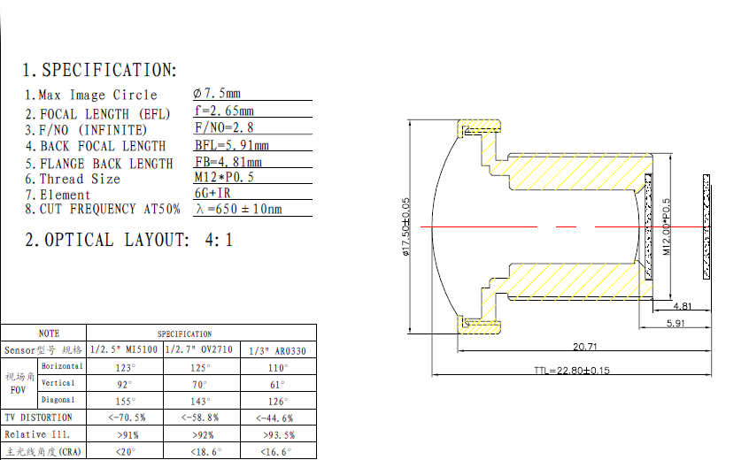 Field of View D=170° (H=130°, V=98°) TTL(mm) 22.8