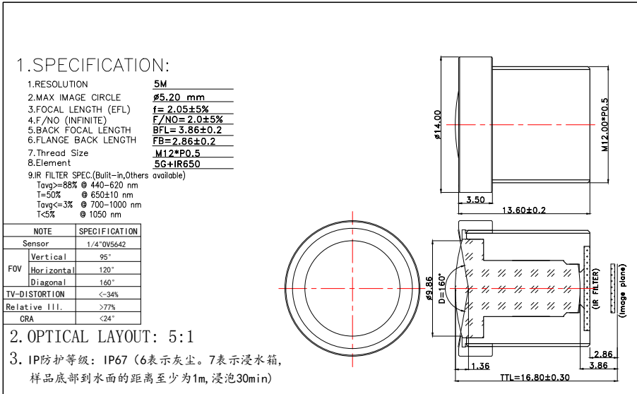Wide Angel 160 degree 2.05 mm 5G high quality 2MP resolution 1/4" M12 Security Camera Lens