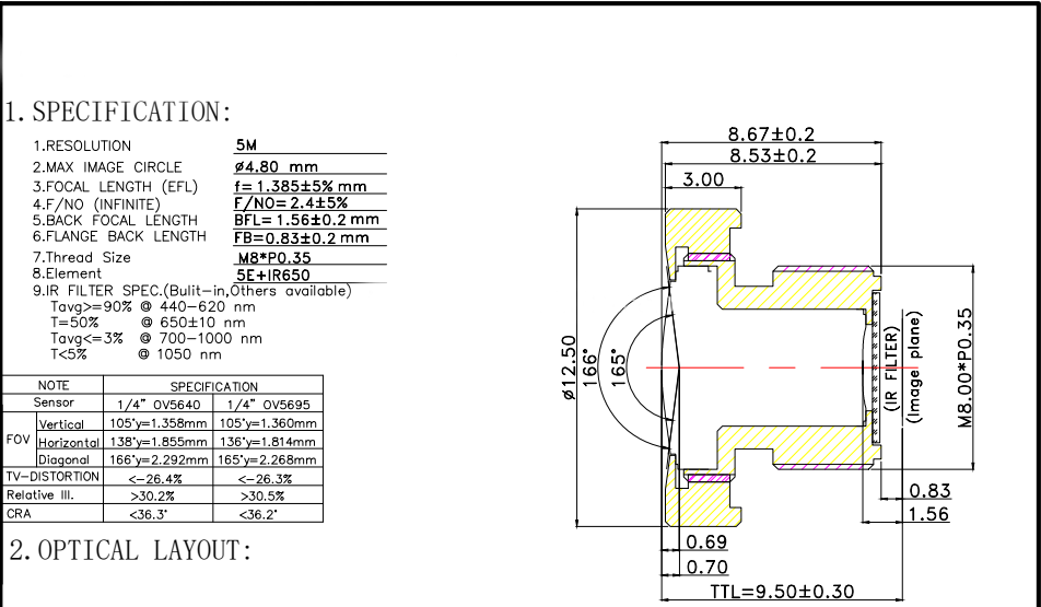 1/4" OV5640 1/6"MT9M114 5MP TTL9.5 Hd F2.4 M8 Camera M7 robot AR/VR Lens
