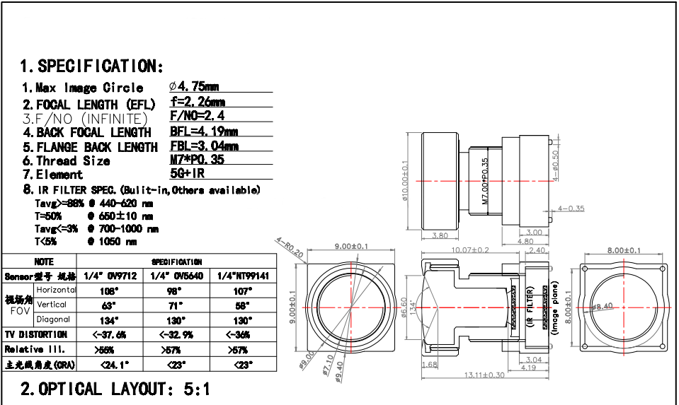 5G M12 1/4" F2.4 TTL13.1HFOV 108 degree for Car Camera