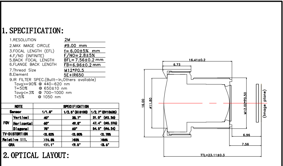 Low distortion F2.6 78 degree 1/1.8" lens 6mm with m12 lens holder