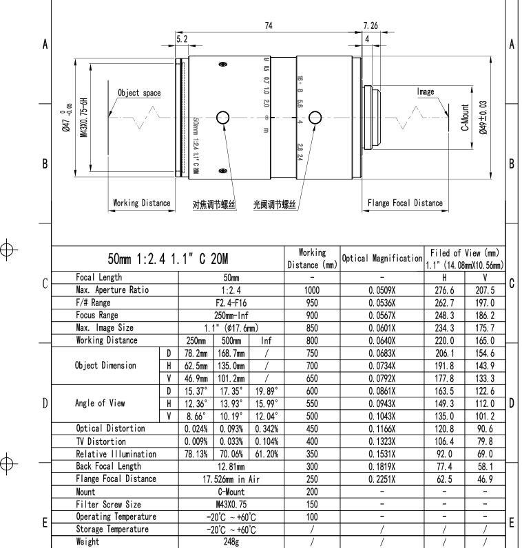 C mount 50mm wide angle lens for industrial cameras machine vision