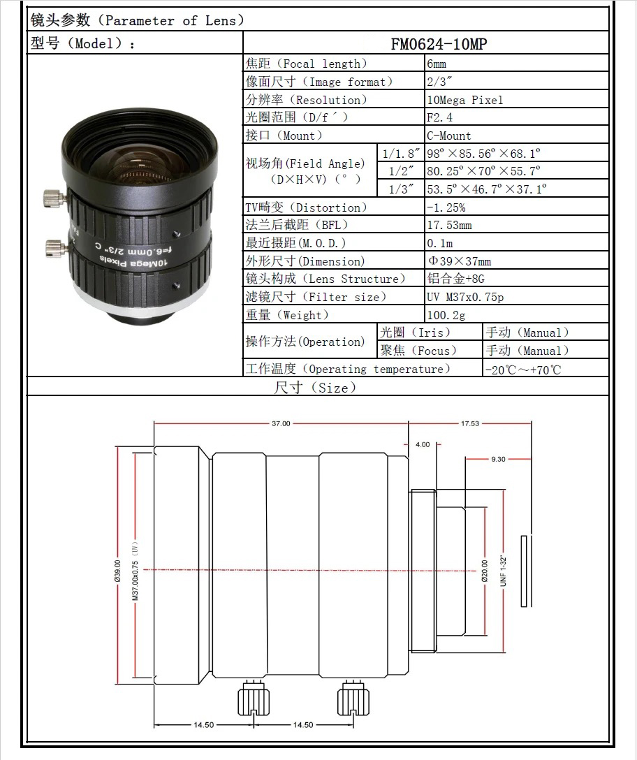 10Meagpixels 6mm 2/3" C Mount CCTV Machine Lens