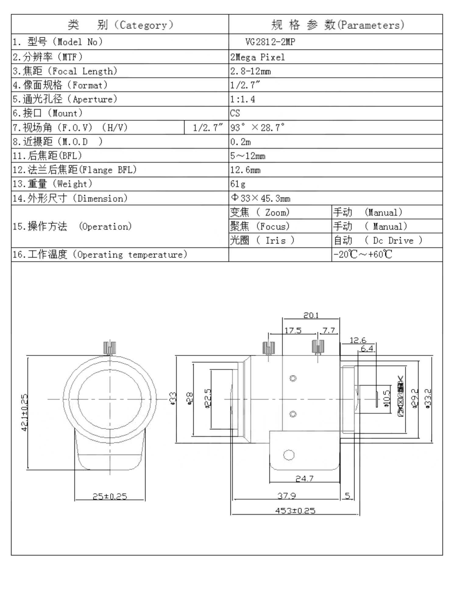 2.8-12mm 2MP CS Mount CCTV Lens Auto Iris Lens Varifocal Lens For CCTV Camera