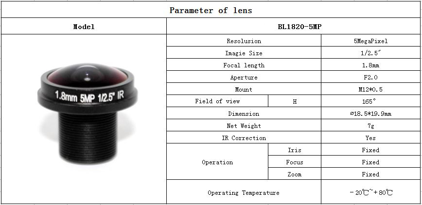 Fisheye lens 1.8mm 5.0 Megapixel F2.0 1/2.5" M12 mount