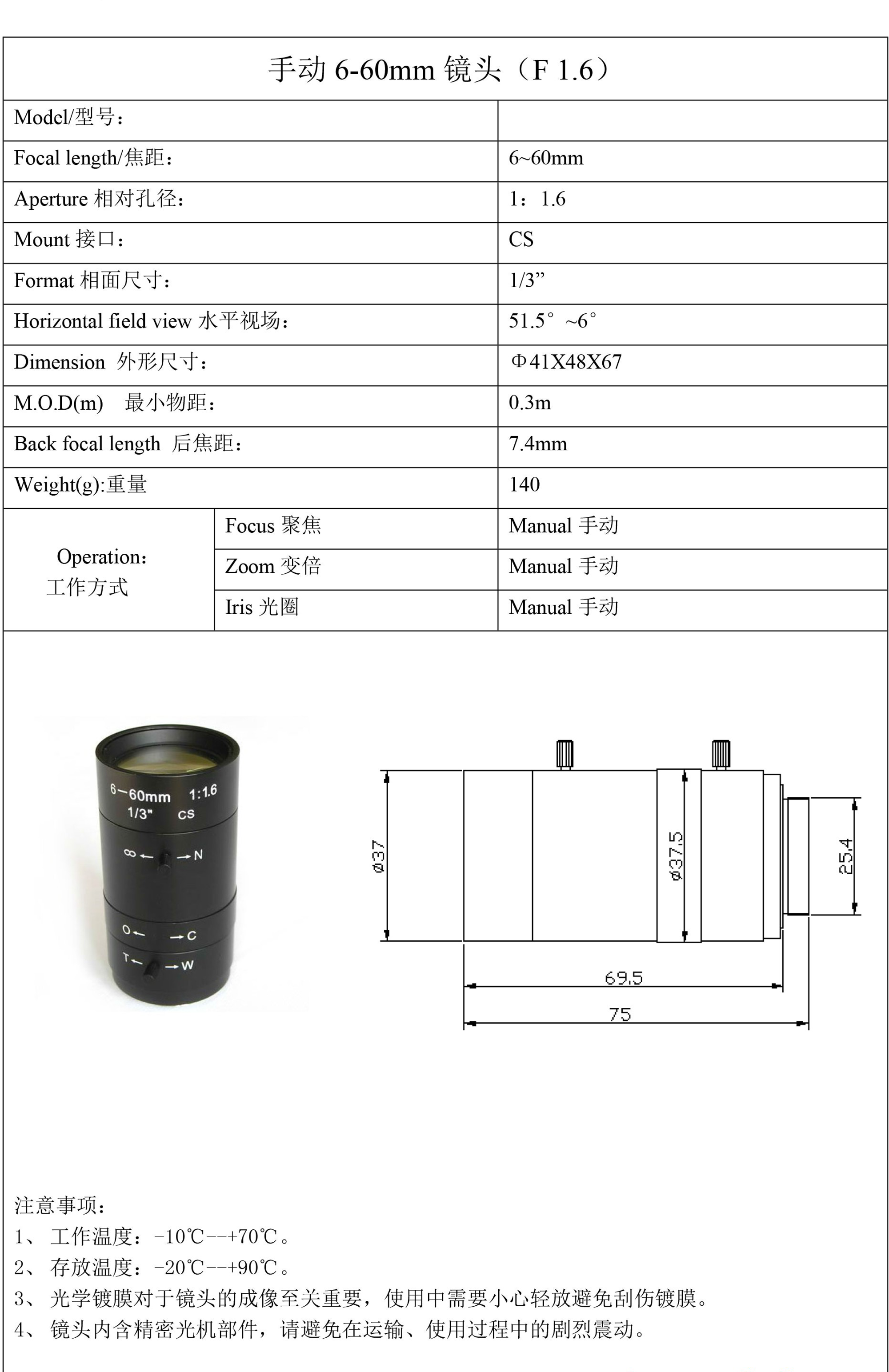 6-60mm CS Mount Varifocal Lens Manual Iris Manual Lens