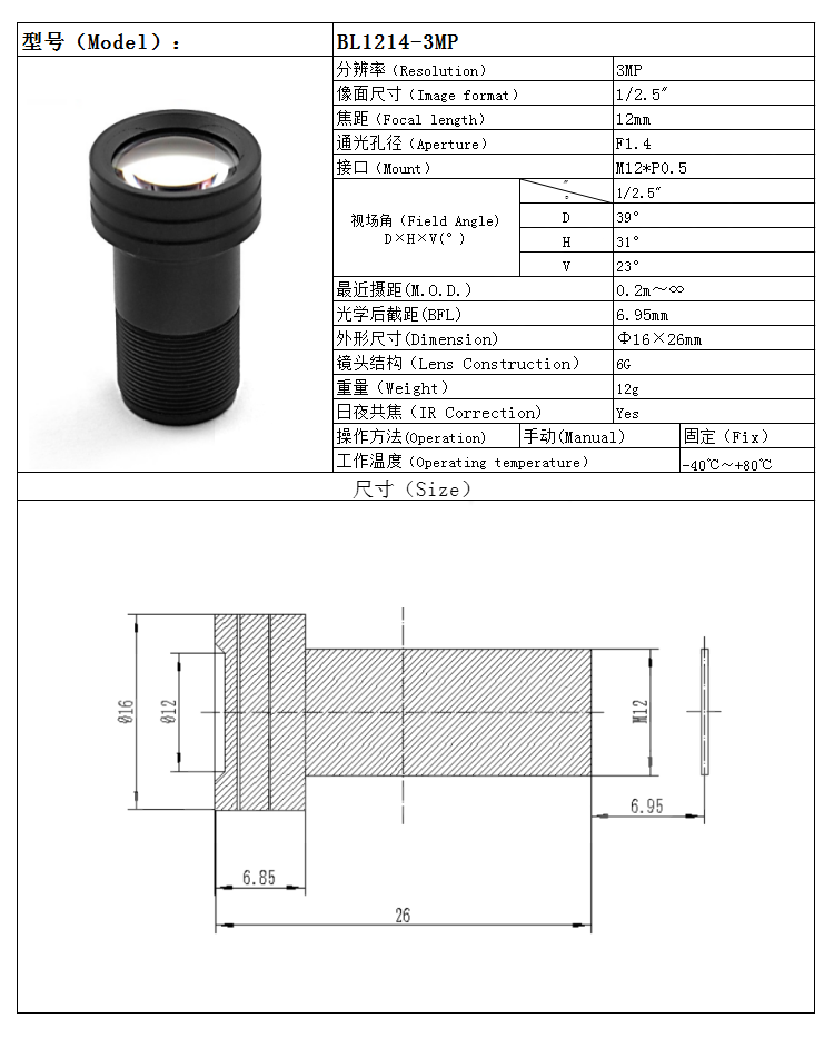F1.2 Starlight Lens 3Megapixel 12mm CCTV Lens