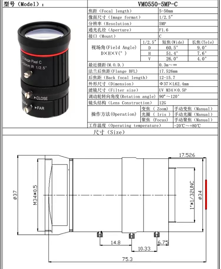 Varifocal lens 6MP Lens 5-50mm CS Mount Auto Iris F1.4 For Industry CCTV IP Camera