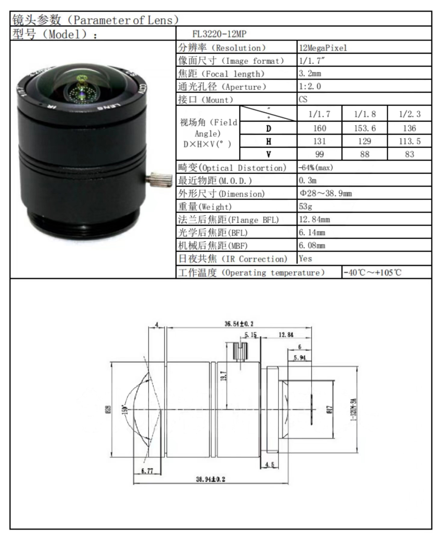 3.2mm Wide angle CS Lens 4k 12MP 1/1.7" CCTV LENS