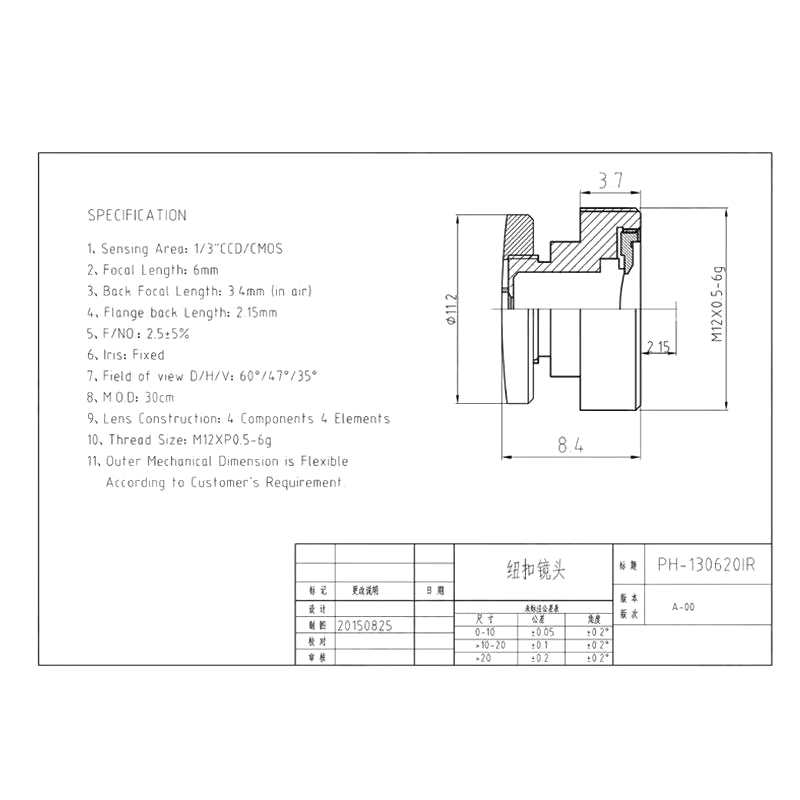 6mm M12 Mount F2.0 2MP CCTV Pinhole Lens
