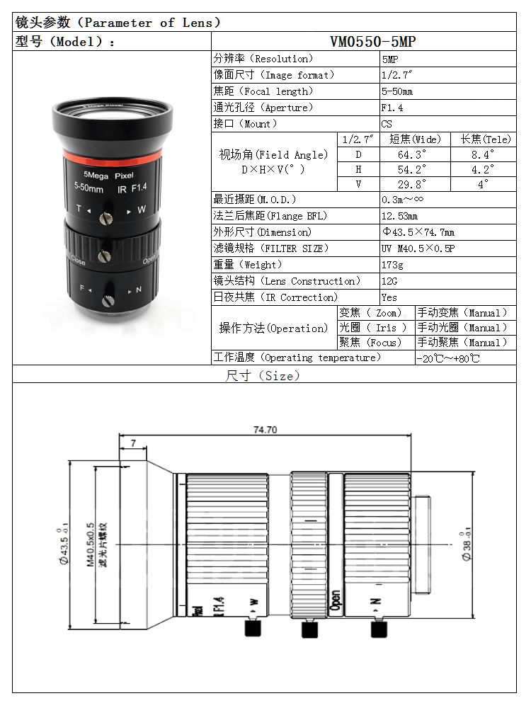 5MP Varifocal Lens 5-50mm CS Mount Manual iris F1.4 For industry CCTV IP Camera