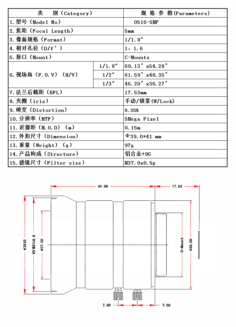 Industrial lens fixed focus 5mm HD 5Mega Pixel F1.6 C-port wide-angle FA machine vision industrial camera lens