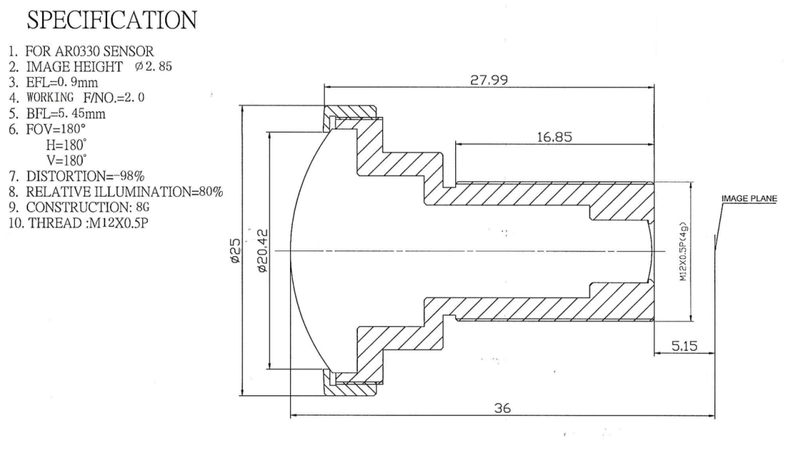 1/2.9" 180X180X180 degree EFL0.9mm F2.0 16M fisheye m12 panoramic cctv lens