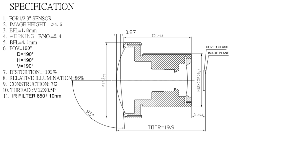 1/2.3" sensor lens wide angle degrees 7G+1E M12 lens for dash camera MJ7038 EFL1.8 190x190x190 16M