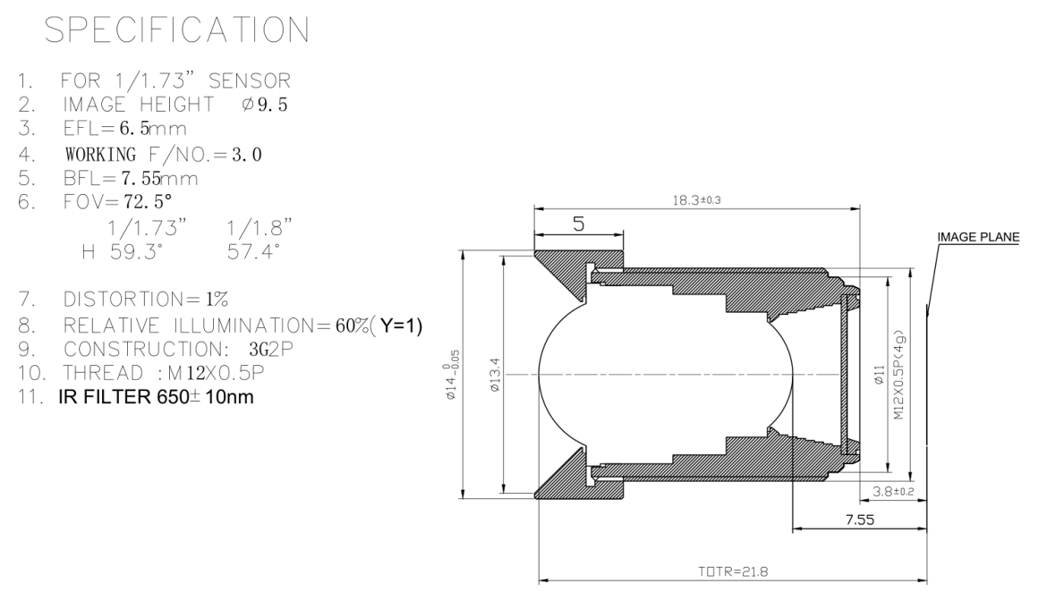 6.5mm 1/1.73" F3.0 Focal Length M12 S-mount Low No Distortion CCTV Board Objektiv Lens