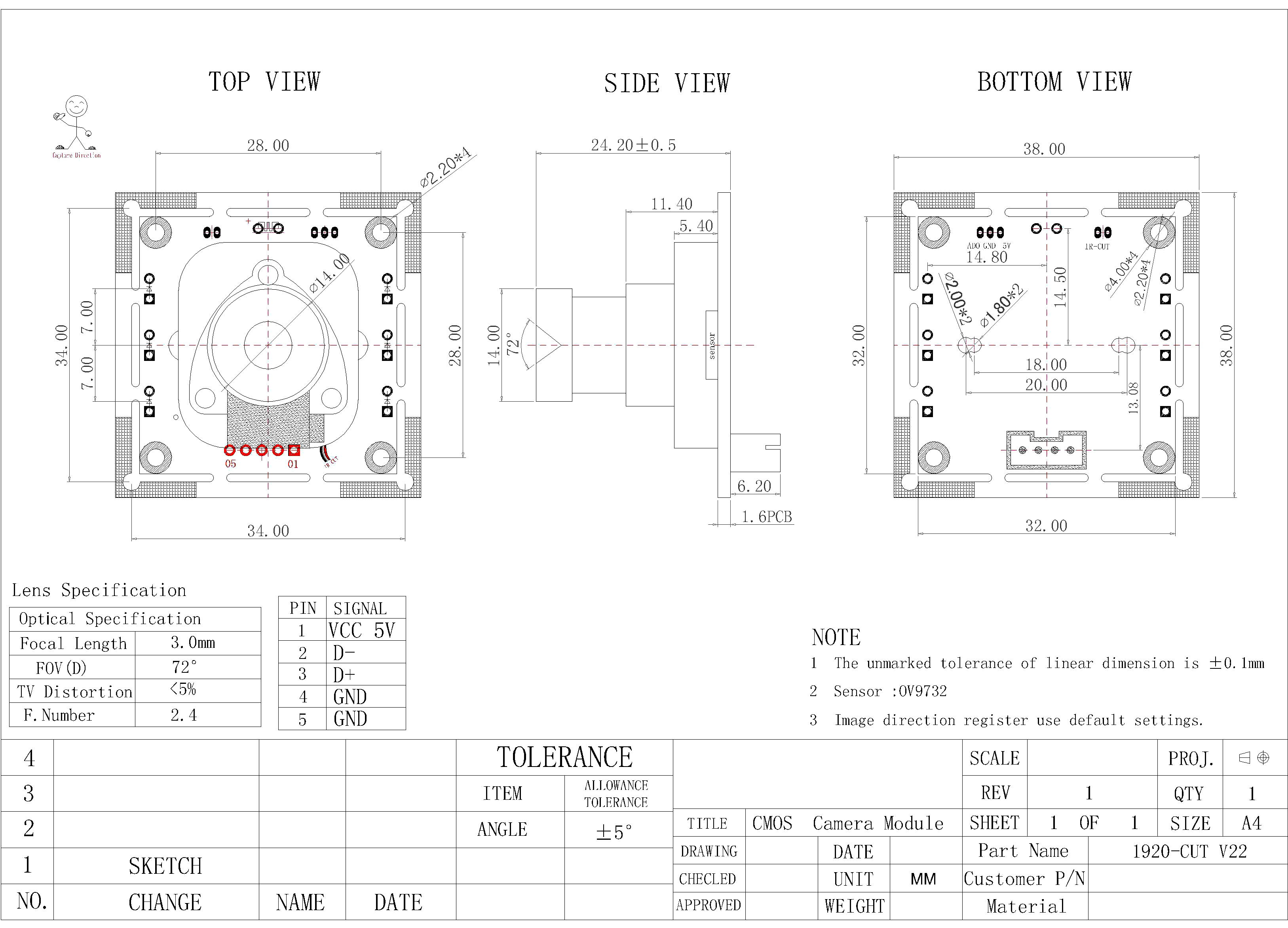 | Sensor | OV9732 (1/4" ) |