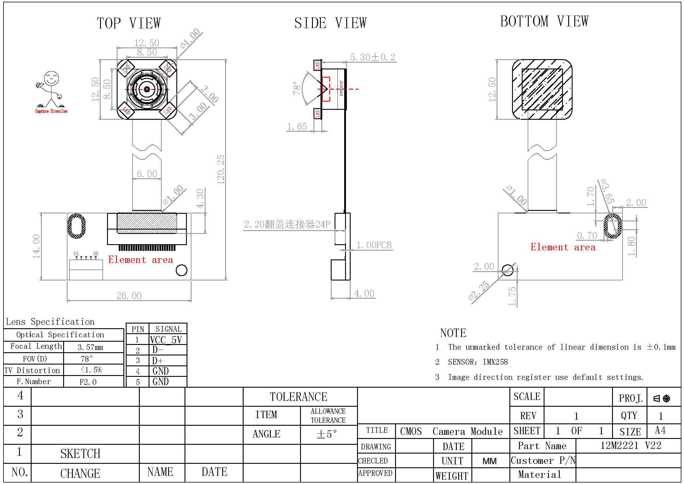 | Features | 1. Flexible structure and small volume of split soft and hard boards 2. The FPC part can be customized in length and shape 3. Default 4K resolution 3840x2160 mjpeg 30 frames 4. Installation hole position compatible with 1466 product structure |