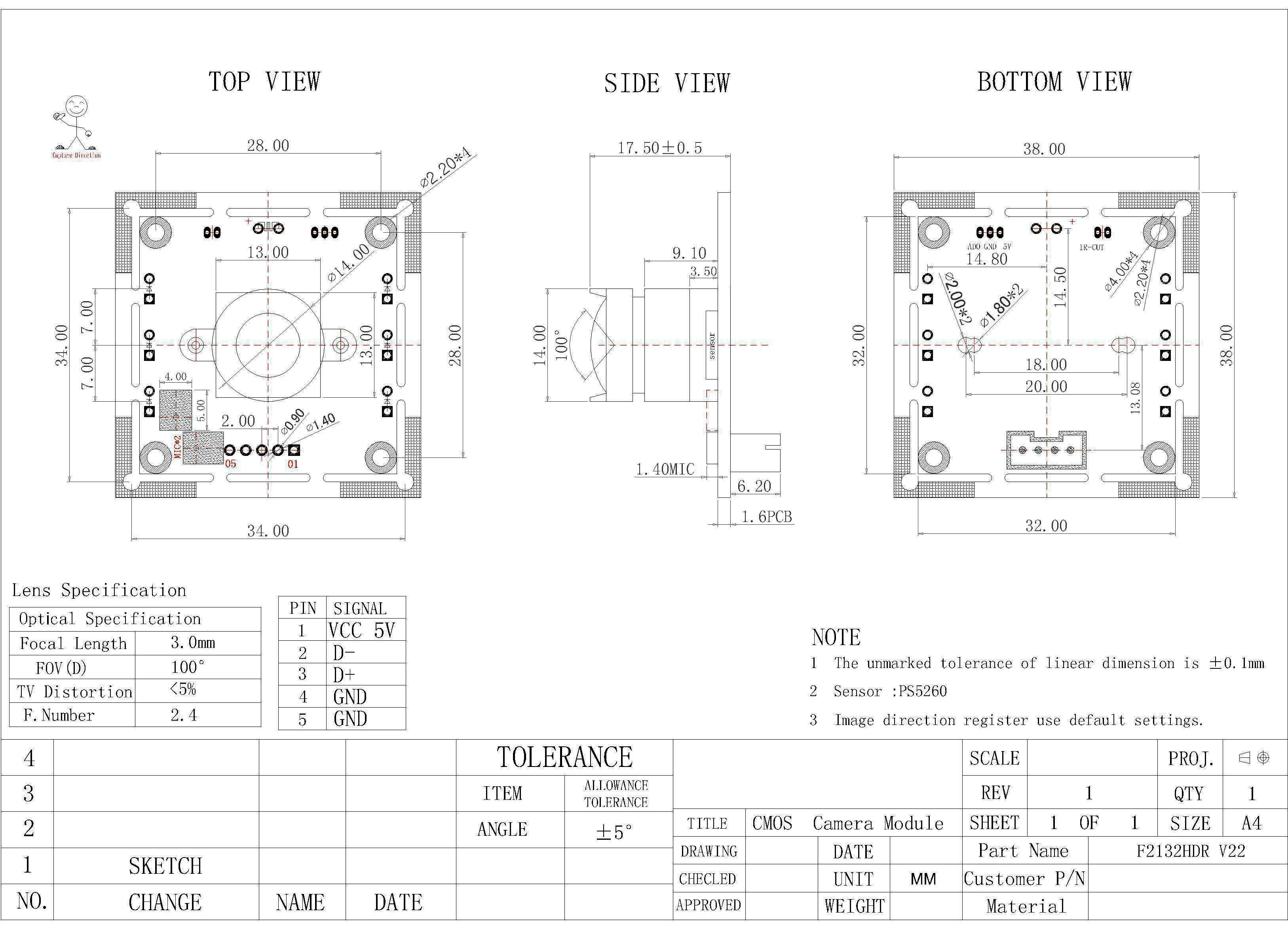 | Product Name | 2MP 100 degree distortion free lens Camera Module |