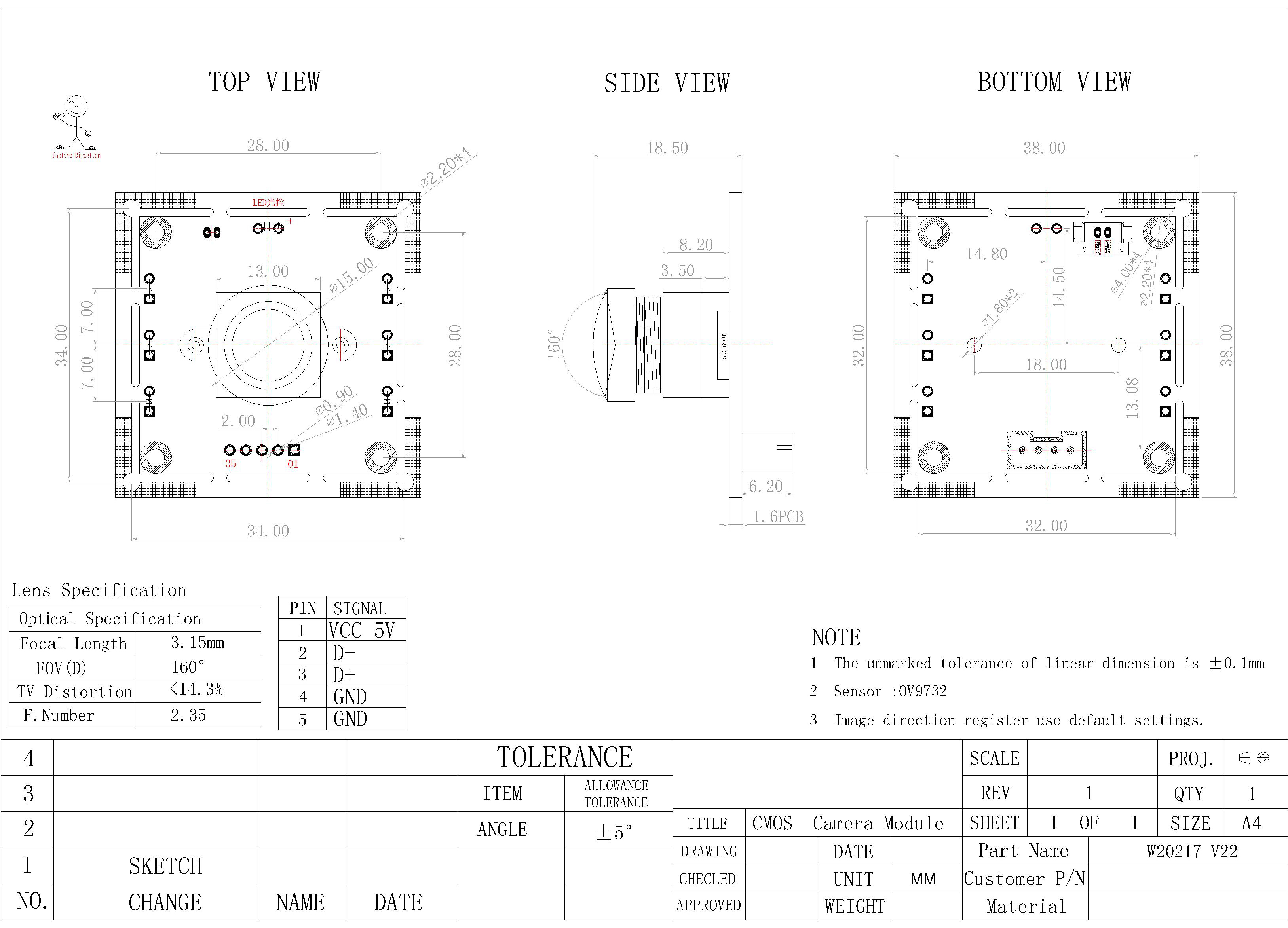 1MP HD 160 Degree View Camera Module PCB Camera Module