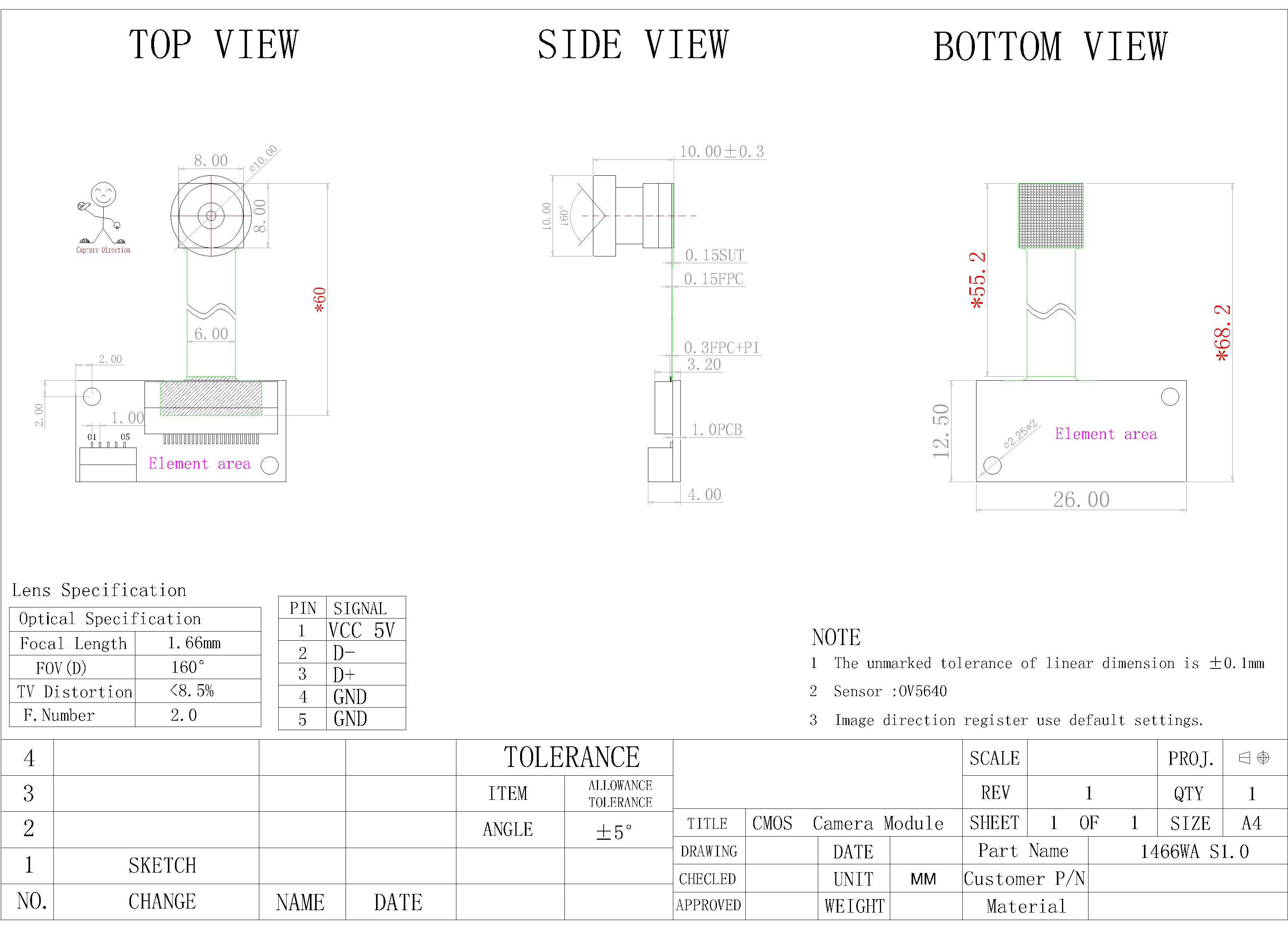ODM 5MP Panoramic Wide Angle FOV 200 Degree OV5640 FPC Camera Module