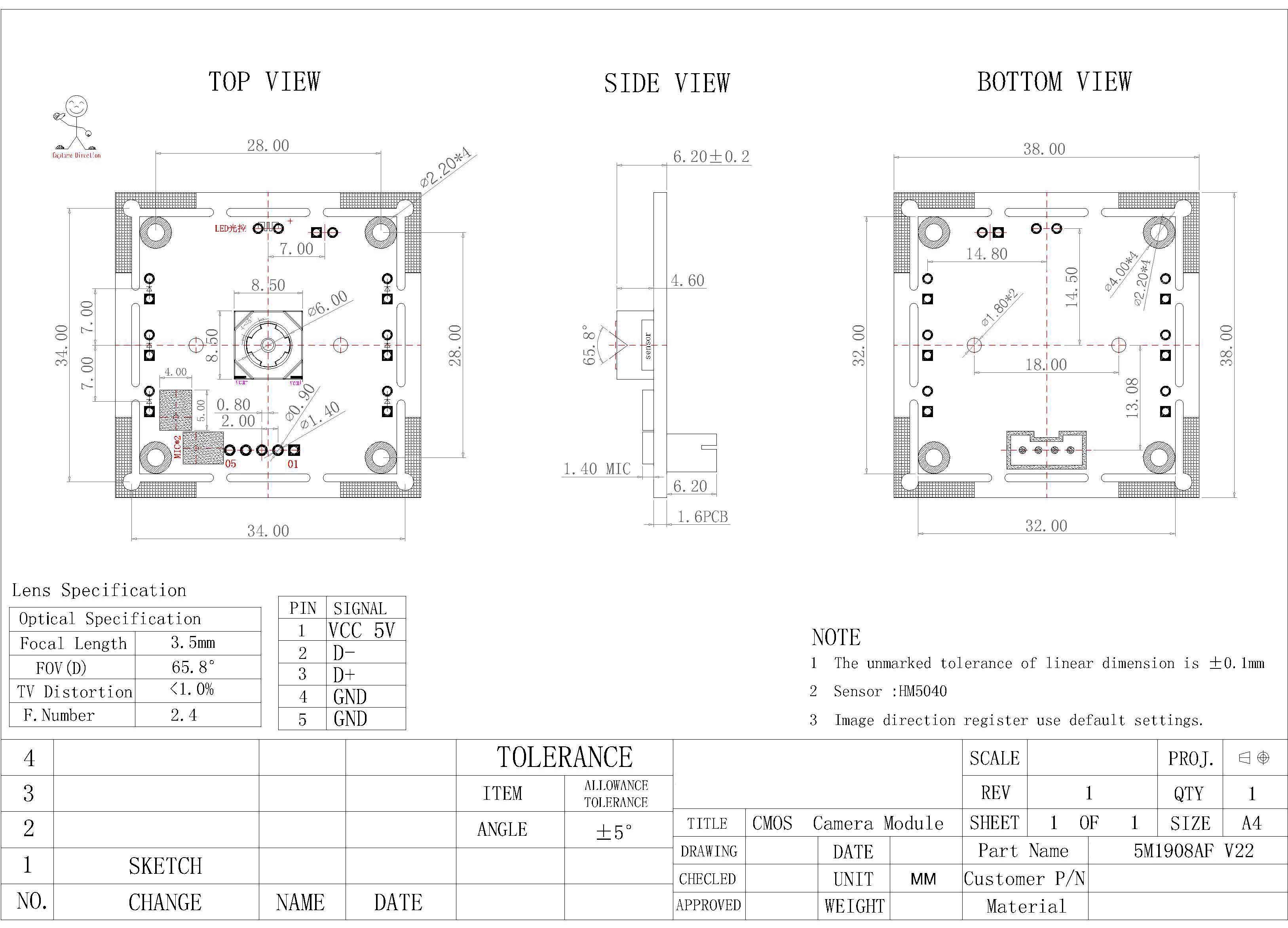 5MP Auto Focus HM5040 Sensor Face Recognition Maximum Resolution 2592*1944 30FPS Cmos Camera Module