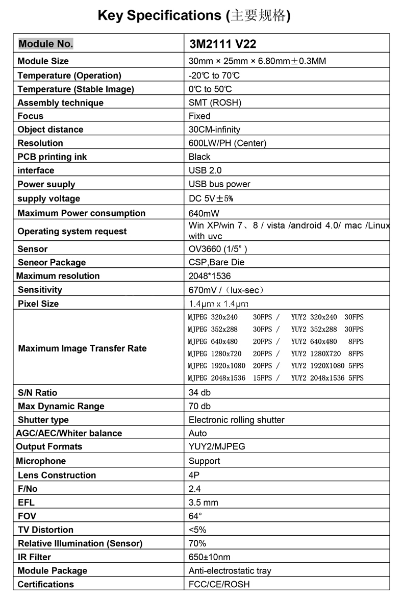 3MP fixed focus OV3660 sensor 1980*1080 20fps mini Camera Module with 64degree lens