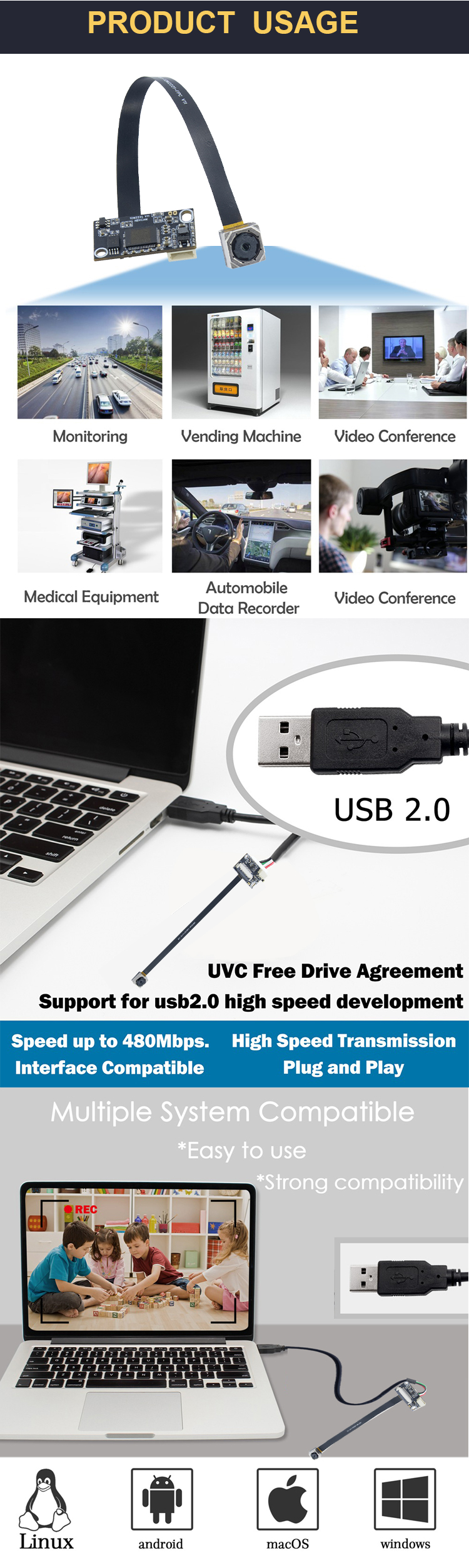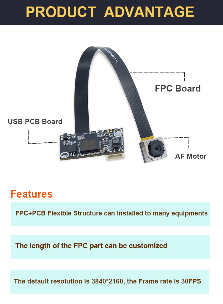1. Flexible structure and small volume of split soft and hard boards2. The FPC part can be customized in length and shape3. Default 4K resolution 3840x2160 mjpeg 30 frames4. Installation hole position compatible with 1466 product structure