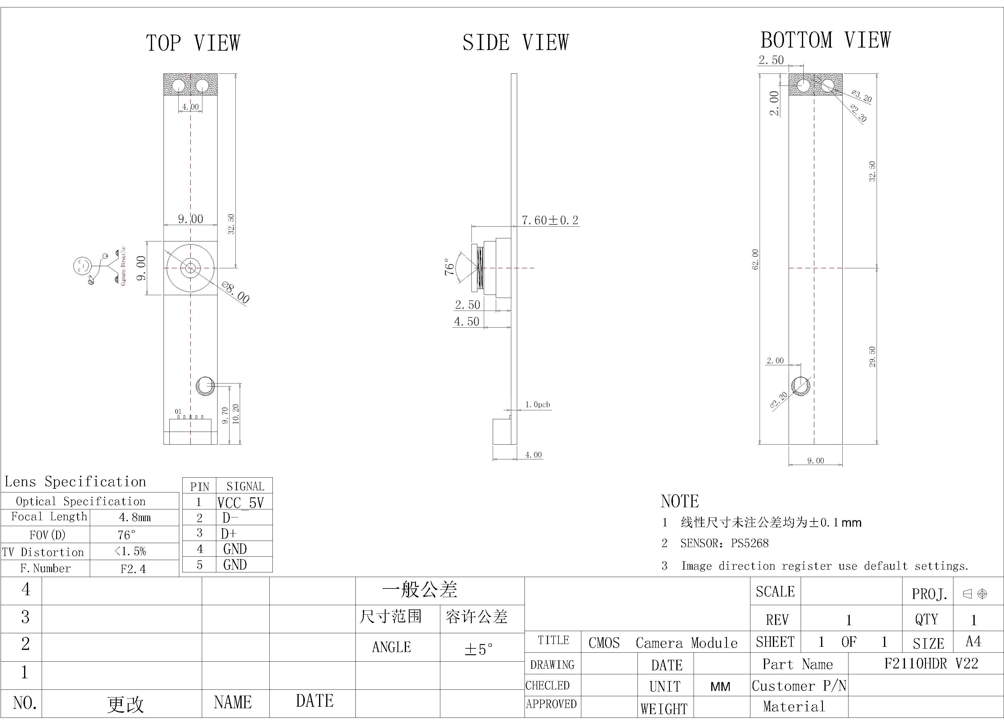Hd Fixed Focus High Frame Rate Camera Module Ps5268 Sensor 2Mp Camera Module With Wide Angle