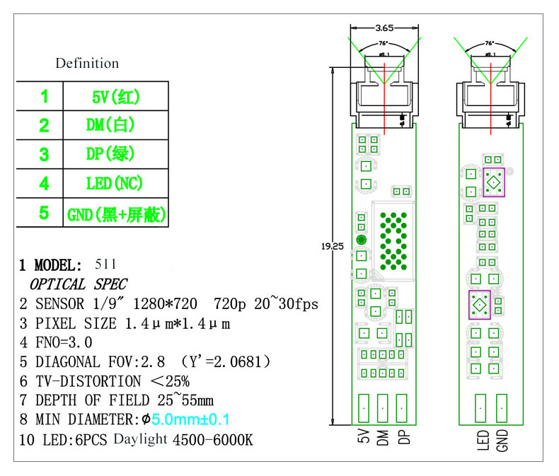 Professional 1MP 30fps 76 degree mini 3.65mm micro endoscope camera module