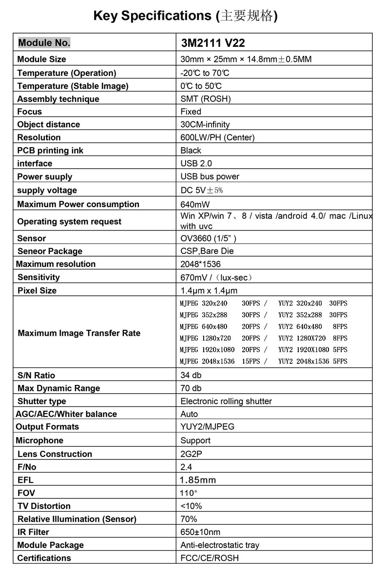 3MP Mini USB Camera OV3660 Sensor 110 degree lens 2048*1536 15fp CMOS Camera Module with Output Formats YUY2/MJPEG