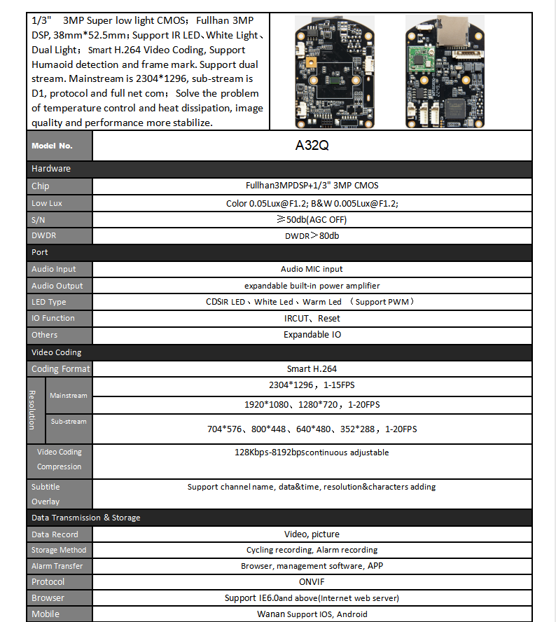 3MP Cloud Camara Module 1/3" CMOS WIFI PCB Board A32Q