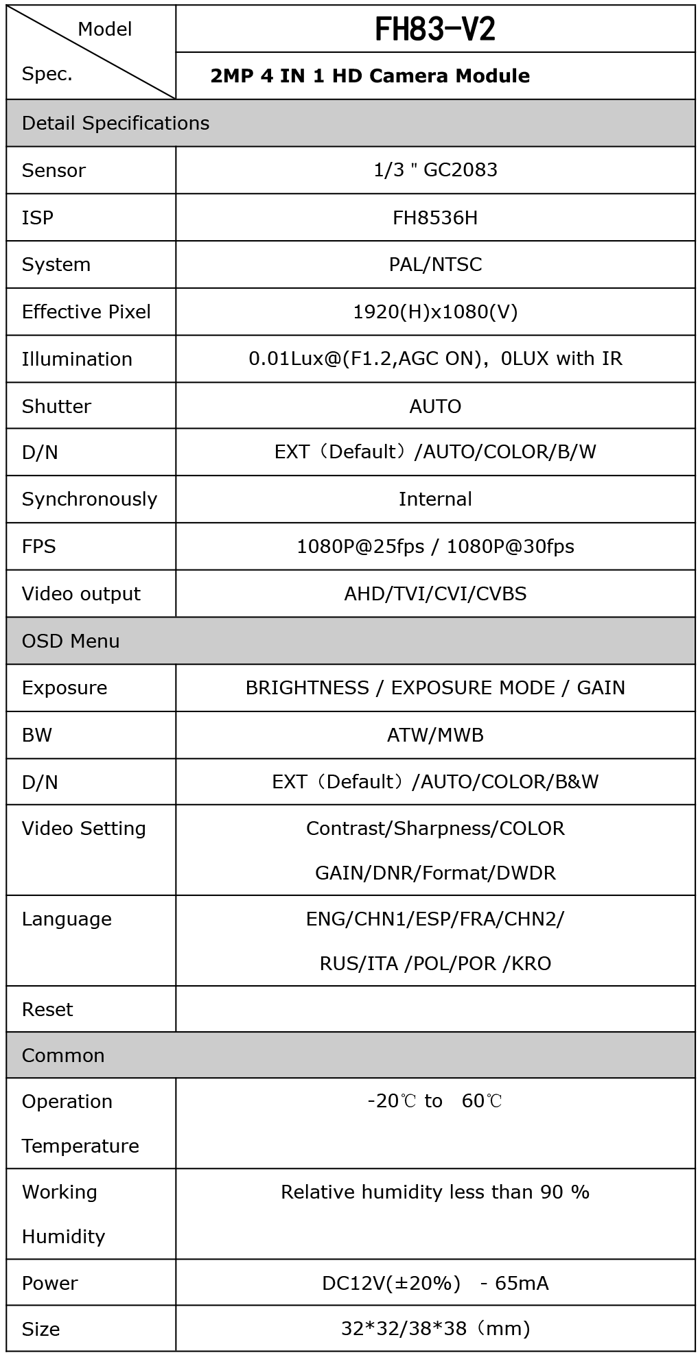 2MP 4 IN 1 AHD PCB Board CCTV Camera Module GC2083+FH8536H Low Cost Effective Support Warm Led IR Led Dual Light