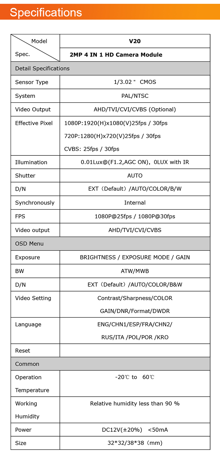 V20 1080P Lower Current Heat Resistant Analog HD Camera Module Support OSD/UTC DWDR colorful night vision 1/3.02" CMOS