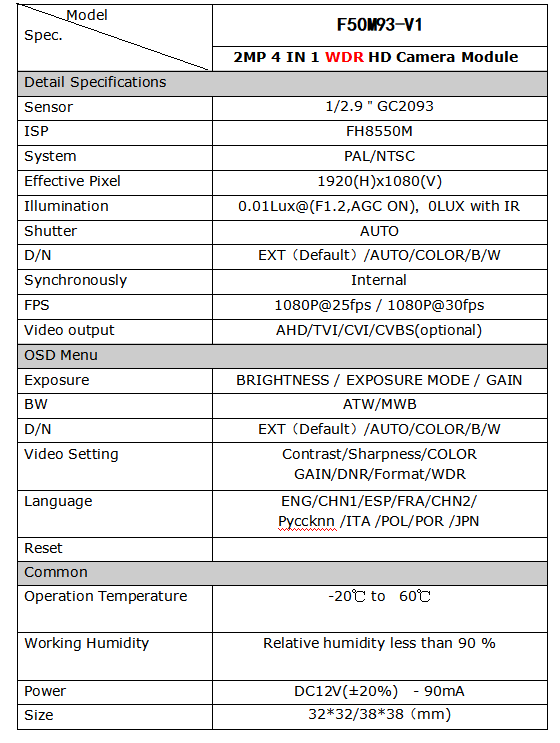 2MP AHD CCTV Camera Module WDR AHD/TVI/CVI/CVBS 4 IN 1 Camera PCB Board Camera LED Customization