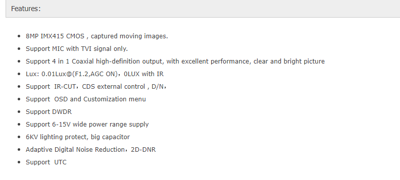 * 8MP IMX415 CMOS , captured moving images. * Support MIC with TVI signal only. * Support 4 in 1 Coaxial high-definition output, with excellent performance, clear and bright picture * Lux: 0.01Lux@(F1.2,AGC ON),0LUX with IR * Support IR-CUT,CDS external control , D/N, * Support OSD and Customization menu * Support DWDR * Support 6-15V wide power range supply * 6KV lighting protect, big capacitor * Adaptive Digital Noise Reduction,2D-DNR * Support UTC | ||
