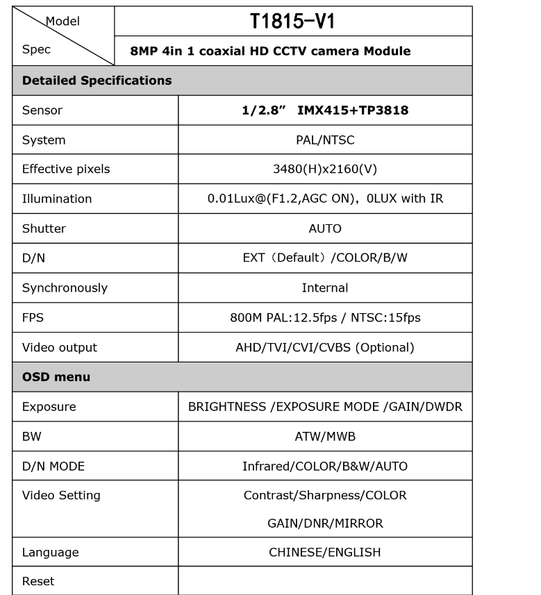Spec. | 8MP 4 in 1 coaxial HD CCTV camera module | |