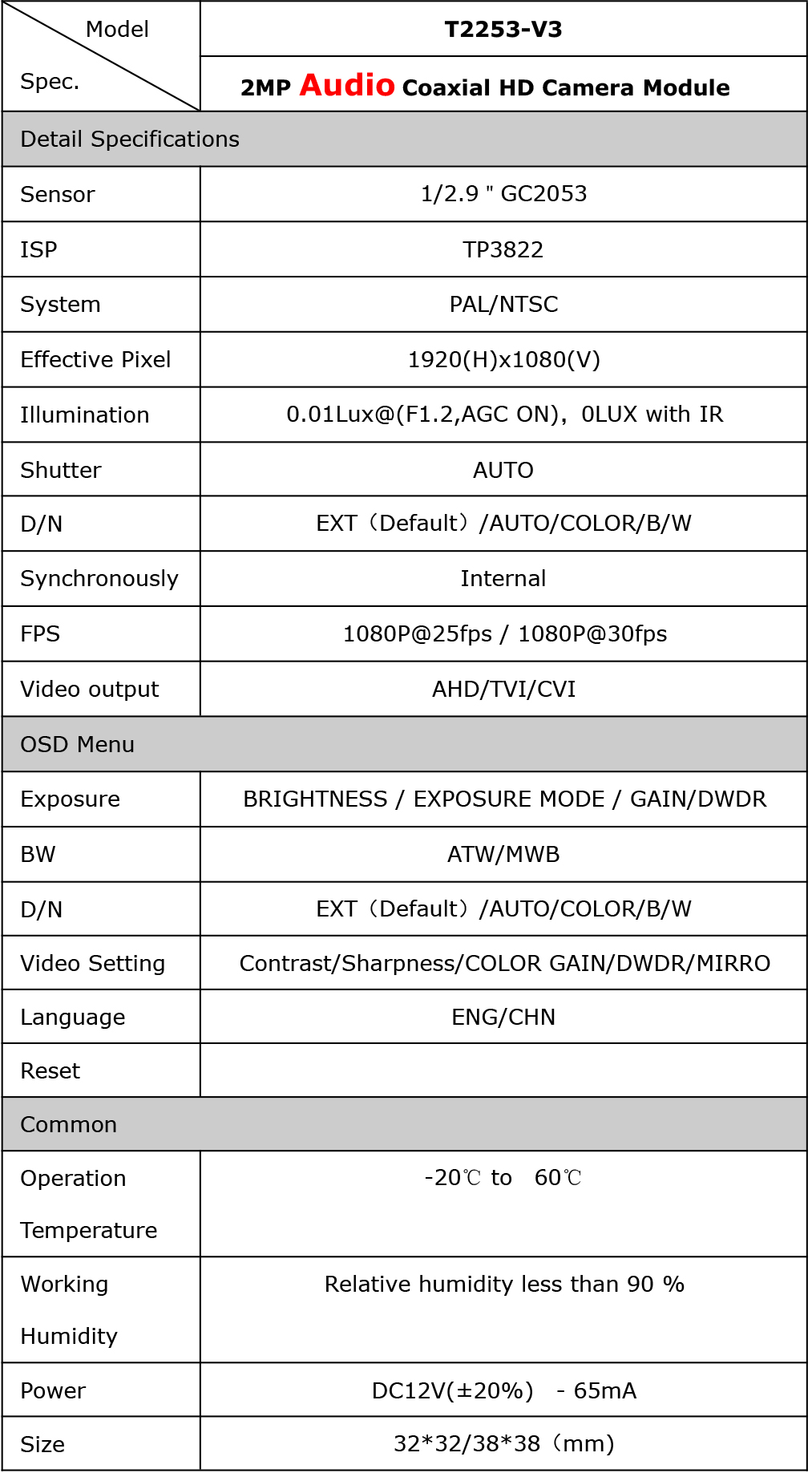 Spec. | 2MP Audio Coaxial Surveillance HD Camera Module |