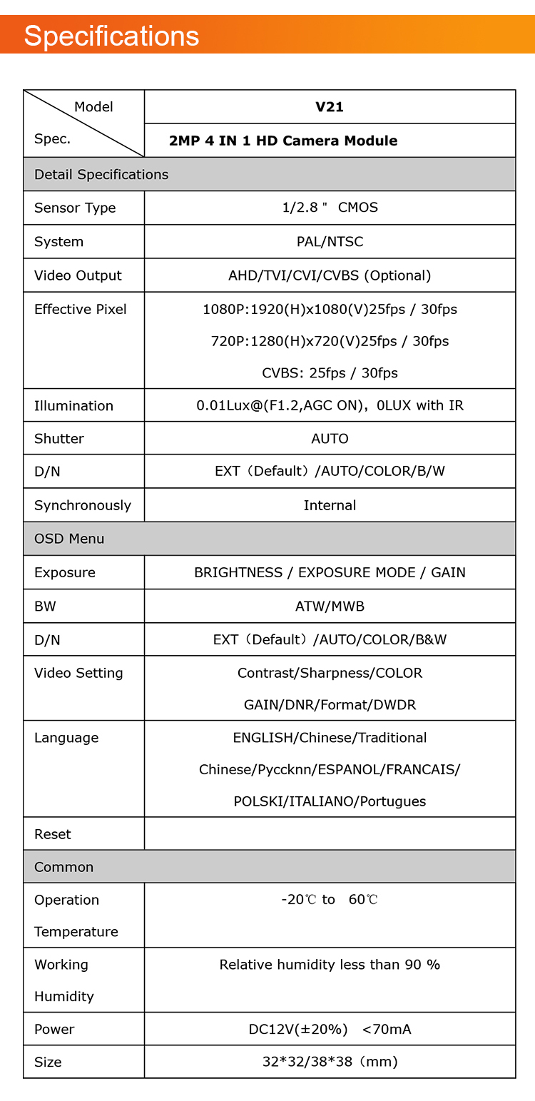 Video output | AHD/TVI/CVI/CVBS(optional) |