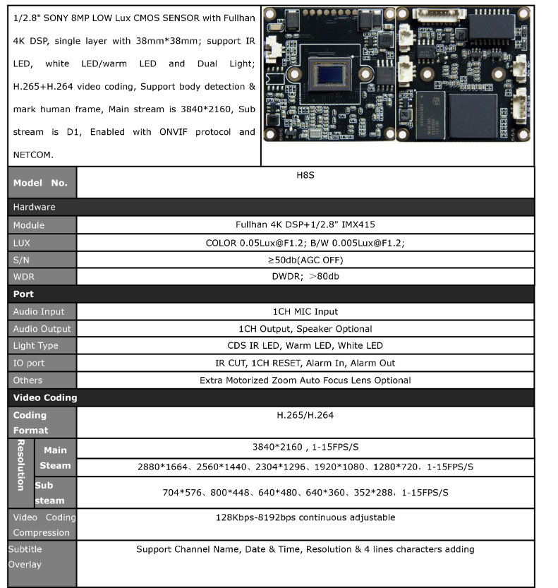 8MP Sensor IP Camara Module H8S PCB Support Human Recognition & mark human frame Support IR LED/Warm Led/Dual Light