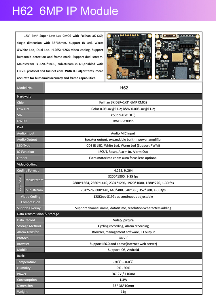 6MP H.265 IP Camera Board Full Color Image Support Warm Light +Dual Light+IR LED Light