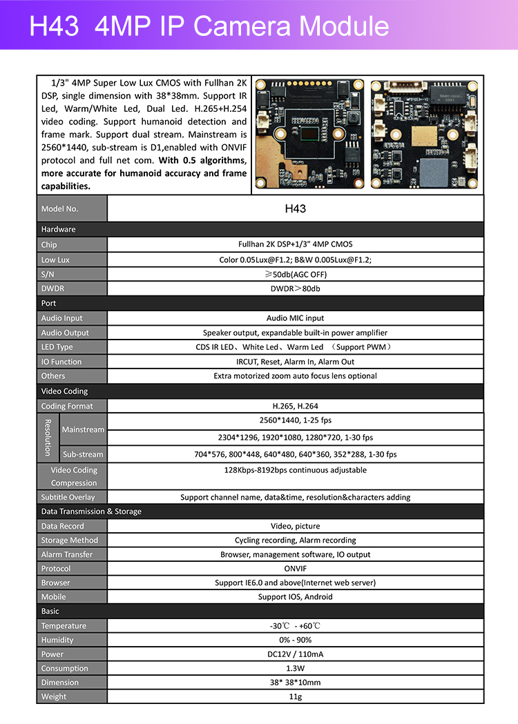 4MP Hihg Clean Night Vision H.265 IP Camera Board Full Color Image Support Warm Light +Dual Light+IR LED Light