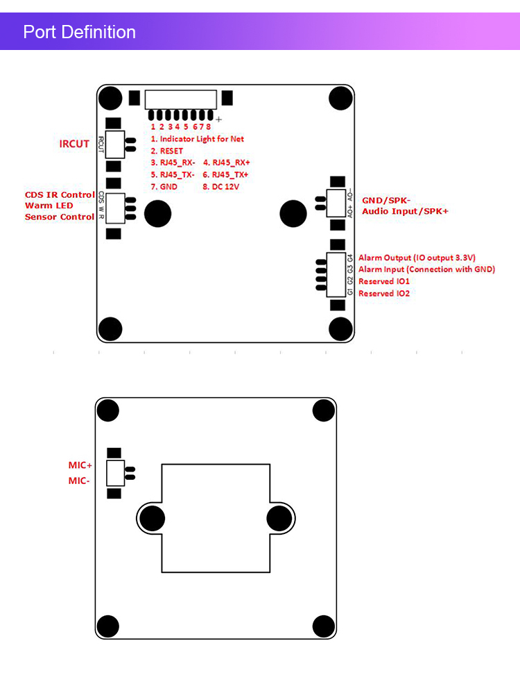 IO port | IR CUT, 1CH RESET, Alarm In, Alarm Out |