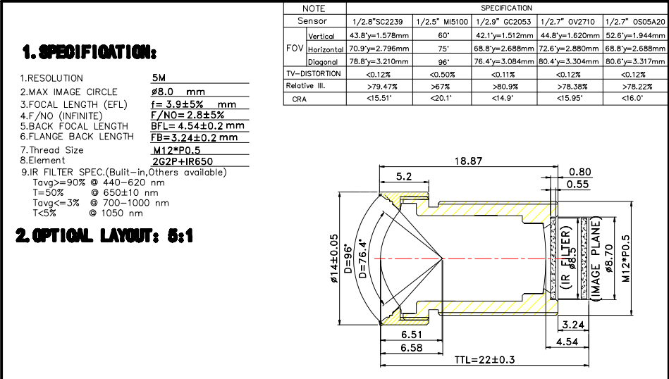 | EFL(mm) | F/NO | Sensor Size | TTL(mm) | HFOV |