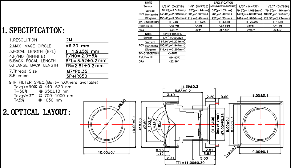 HD Camera Lens F2.0 M7 Lens Fixed Focus for Vehicle 1/2.9" 6.3mm Sensor Wide Angle Lens