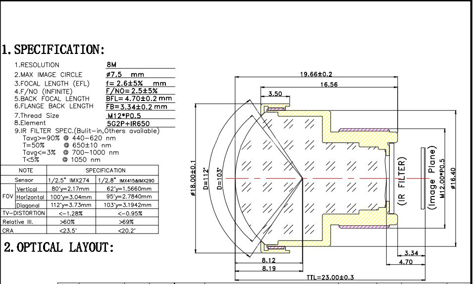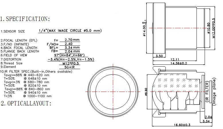 | EFL(mm) | F/NO | Sensor Size | TTL(mm) | HFOV |