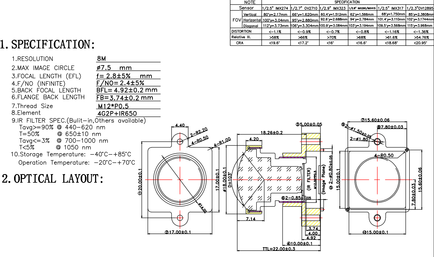 | Image Circle | 1/2.5" IMX274 |